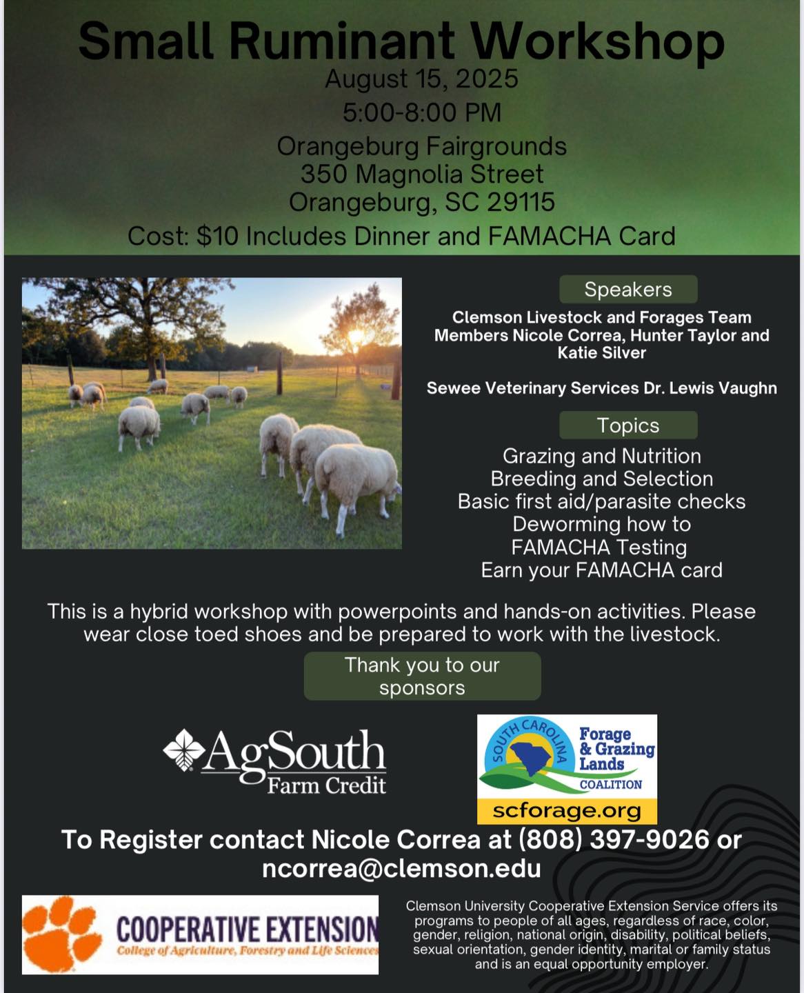 Topics include: This is a hybrid workshop with powerpoints and hands-on activities. Please wear closed toe shoes and be prepared to work with the livestock. Dinner and FAMACHA card included…